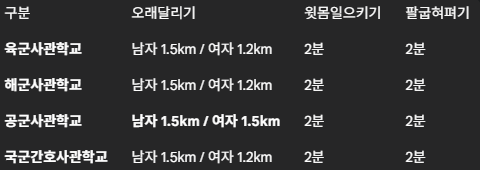 다만 공군사관학교의 경우 오래달리기 거리가 여학생 차등이 없다는 점은 유의하셔야 합니다.